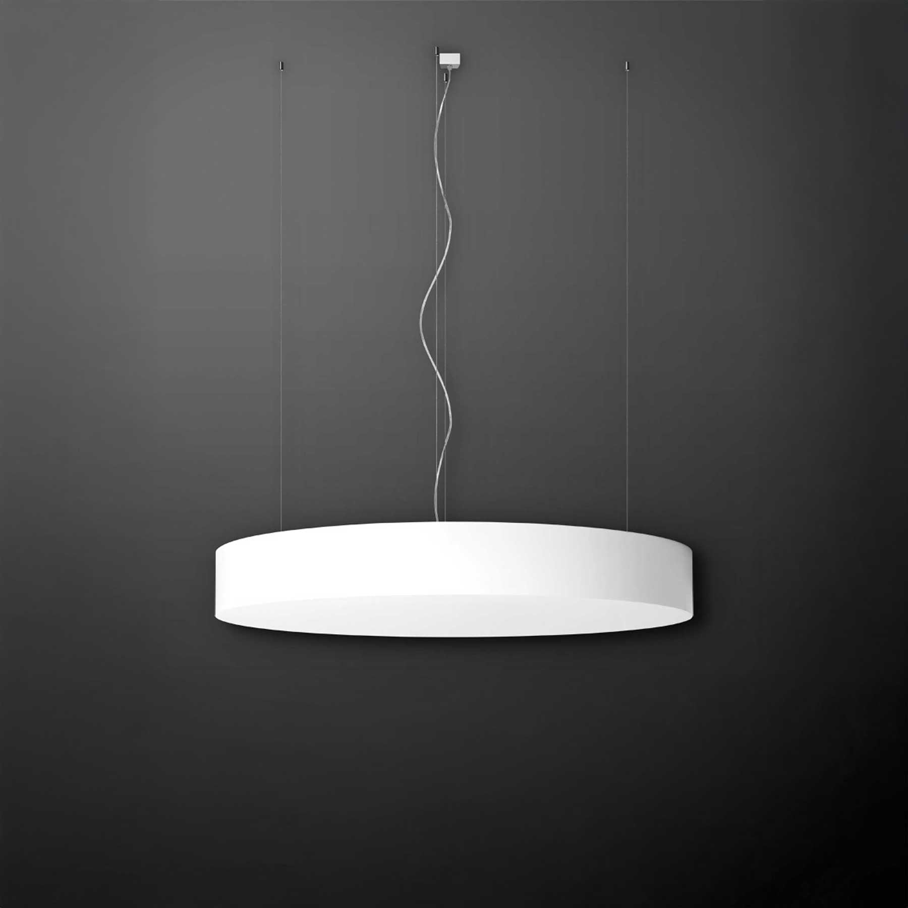 The Izar R Max pendant light from the Czech company Lucis is a modern and elegant lighting element, which is characterized by its minimalist design and high functionality. It is available in four sizes with diameters of 700 mm, 900 mm, 1200 mm and 1500 mm, which allows its flexible use in different types of interiors. The luminaire offers variants with a light temperature of 3000 K (warm white) or 4000 K (neutral white) and is available with both lower and higher wattages according to the lighting intensity requirements. The shade is made of high quality acrylic glass, which ensures even light diffusion, while the steel sheet cover is white painted, which enhances the clean look of lighting. The whole system is suspended from a cable mechanism with a transparent cable, which gives the luminaire a light and unobtrusive installation.