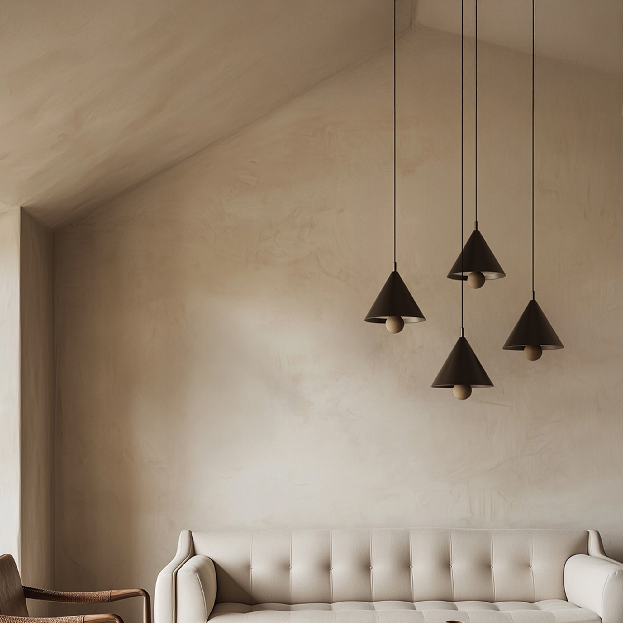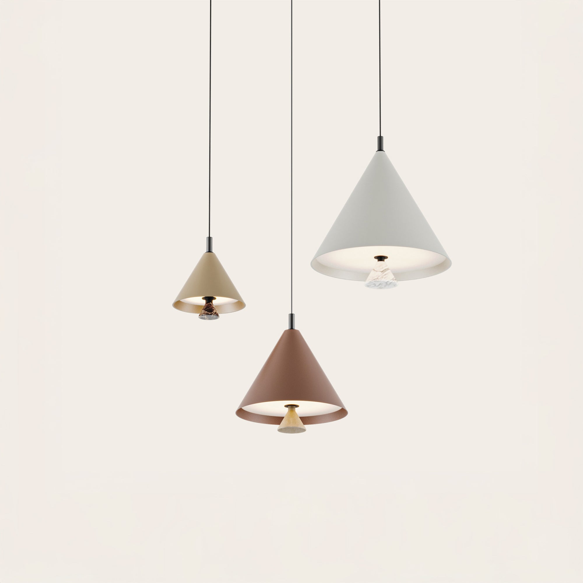 Lampa wisząca Marg hiszpańskiej marki Aromas del Campo, zaprojektowana przez Pepe Fornas, wyróżnia się minimalistyczną elegancją i doskonałą równowagą między metalem a kamieniem. Korpus oprawy składa się z metalowego stożka, dostępnego w matowej, teksturowanej czerni lub bieli, lub w innych odcieniach z palety kolorów pokazanej w galerii zdjęć. Wyjątkowym detalem jest element dekoracyjny w dolnej części oprawy, który można wybrać z naturalnego trawertynu lub marmuru w kolorze czarnym, białym, brązowym lub zielonym. Marg jest wyposażony w zintegrowane źródło światła LED i technologię ściemniania TRIAC, która umożliwia płynną regulację natężenia oświetlenia. Oprawa jest dostępna w trzech rozmiarach - 200 mm, 300 mm i 400 mm, dzięki czemu można ją elastycznie stosować samodzielnie lub w kombinacjach, aby stworzyć harmonijną kompozycję świetlną w każdym wnętrzu.