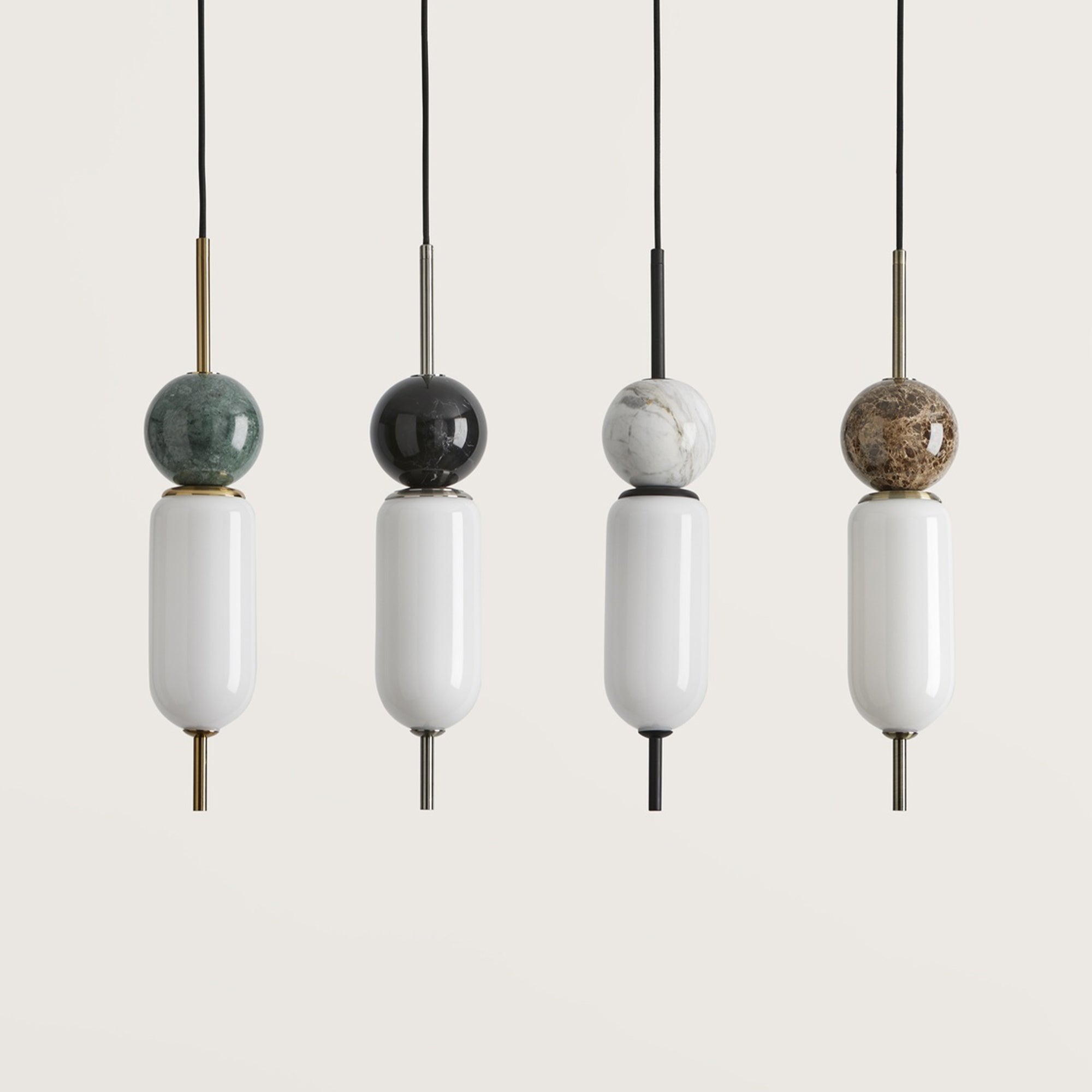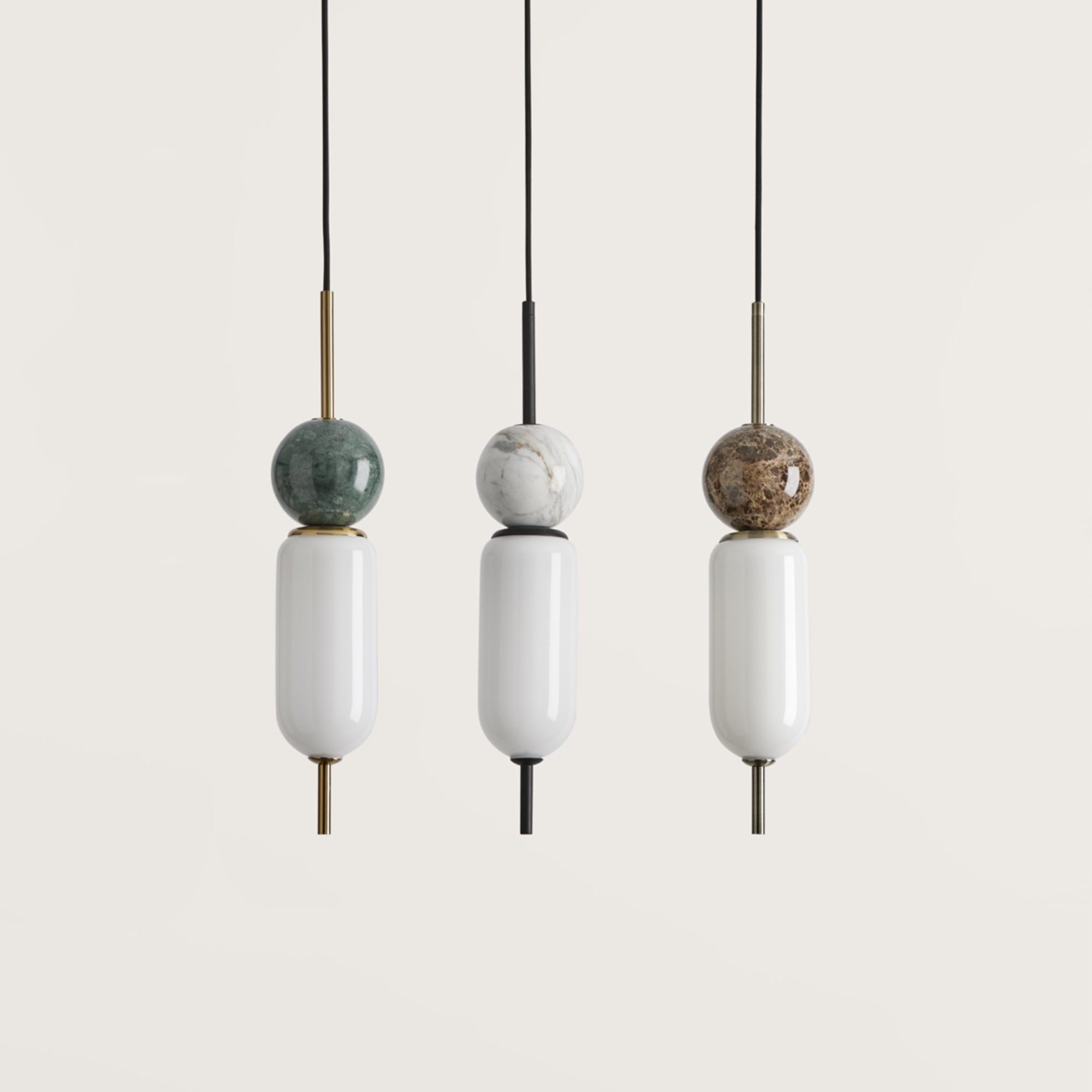 Závěsné svítidlo Anet od španělské značky Aromas del Campo je elegantní designový prvek, který kombinuje hladké minimalistické linie s luxusním detailem v podobě dekorativní mramorové koule. Hlavní tělo svítidla tvoří podlouhlý opálový difuzor, který vytváří měkké a rovnoměrné osvětlení, zatímco kovové části lze volit ve čtyřech stylových úpravách – niklové, černé, zlaté nebo bronzové. Dekorativní prvek z přírodního mramoru je dostupný v barvě černé, bílé, zelené nebo hnědé, což umožňuje perfektní sladění s interiérem. Svítidlo je vybaveno světelným zdrojem G9, který je součástí balení (5W – 2700K), a díky svému čistému a modernímu vzhledu se skvěle hodí nad kuchyňské ostrůvky, do obývacího pokoje či do elegantních komerčních prostor.