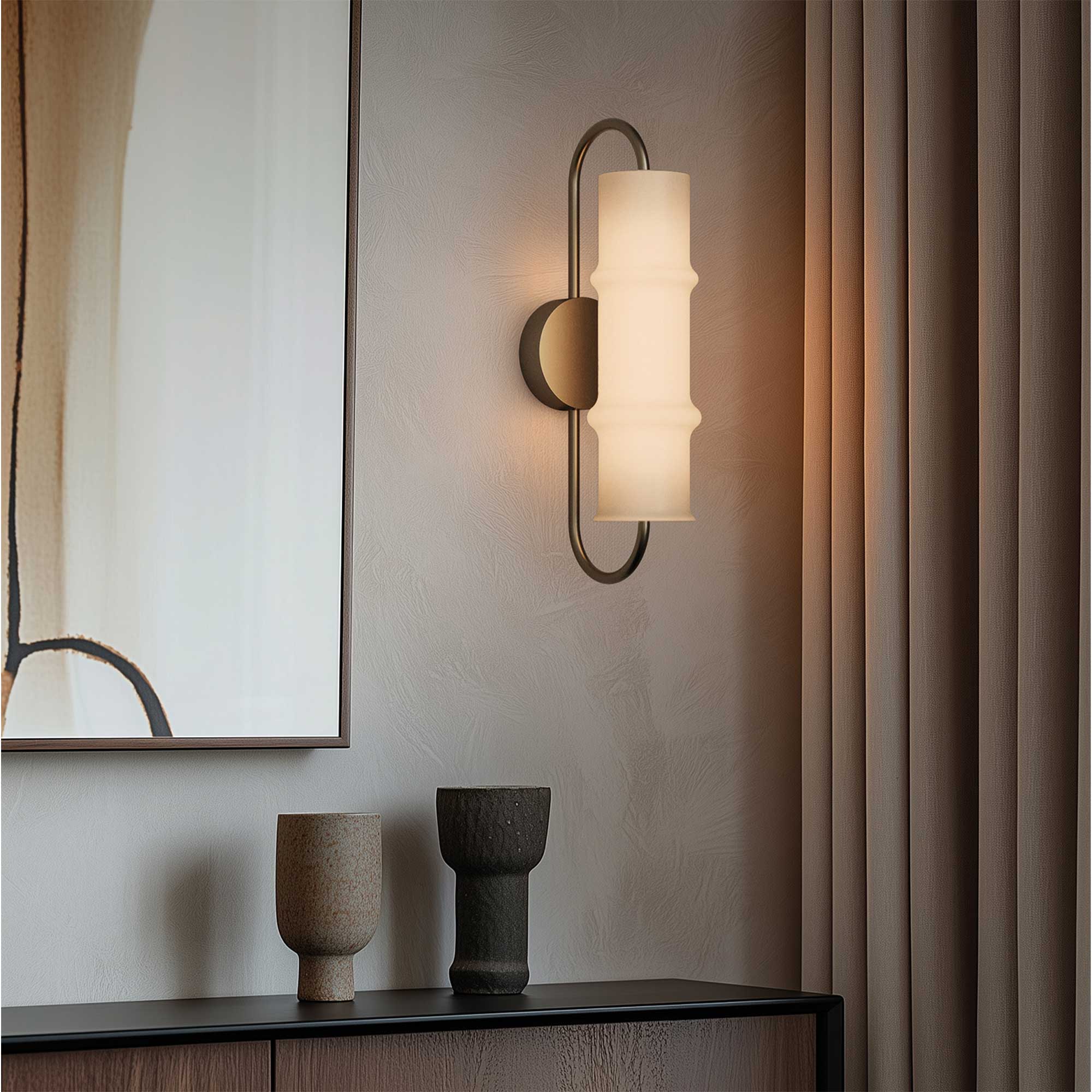 Nástěnné svítidlo Canna od značky Aromas del Campo, navržené designérem Agusem Gascónem, zaujme organickým designem inspirovaným jednoduchostí a pevností bambusu. Tělo svítidla je vyrobeno z kvalitního opálového skla, které jemně a rovnoměrně rozptyluje světlo, a tím vytváří příjemnou a útulnou atmosféru. Díky svému tvaru a světelnému charakteru je ideální volbou pro osvětlení čel postelí, vstupních hal nebo chodeb, kde dokáže dodat prostoru eleganci i funkční světlo. Kolekce Canna zároveň zahrnuje i dvě závěsné varianty – menší, která působí subtilně, a větší, určenou pro odvážnější projekty. Kovové detaily jsou dostupné v povrchových úpravách patinované zlato nebo matná černá s texturou, což umožňuje snadno sladit svítidlo s různými interiérovými styly. Integrovaný LED zdroj 12W SMD 2700K poskytuje teplé bílé světlo o intenzitě 750 lm a díky kompatibilitě s externím TRIAC stmívačem lze regulovat jas přesně podle vašich potřeb.