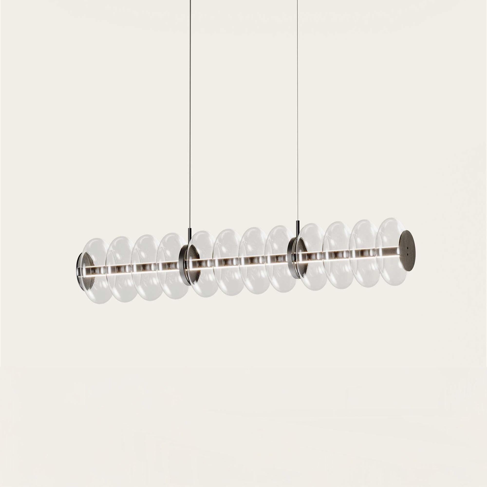 Závěsné svítidlo Vitree L od značky Aromas del Campo je impozantní verzí klasického modelu Vitree, tvořenou propojením tří stínidel Vitree v podélném uspořádání. Každé stínidlo je z čirého vlnitého skla s kovovými detaily v matné černé nebo patinované zlaté, a společně vytvářejí efektní designový prvek vhodný pro větší prostory. Uvnitř se nachází integrovaný stmívatelný LED pásek Tira 28W, 2700K, 2000 lm, TRIAC regulable, který poskytuje příjemné teplé světlo a možnost přesného stmívání. Vitree L je ideální nad jídelní stůl, do obývacího pokoje nebo moderních komerčních interiérů, kde chcete skloubit design, světelnou funkčnost a sofistikovanou eleganci.
