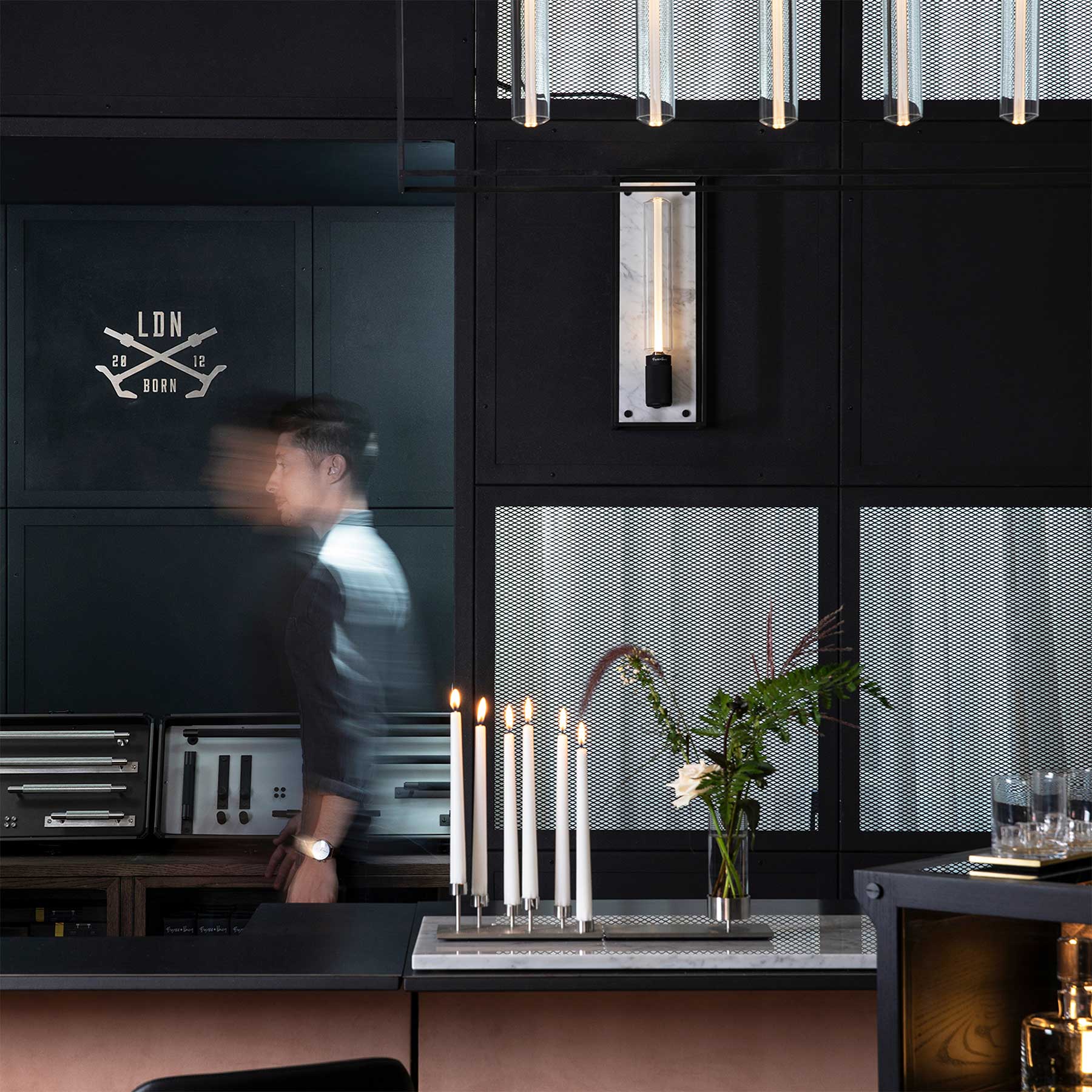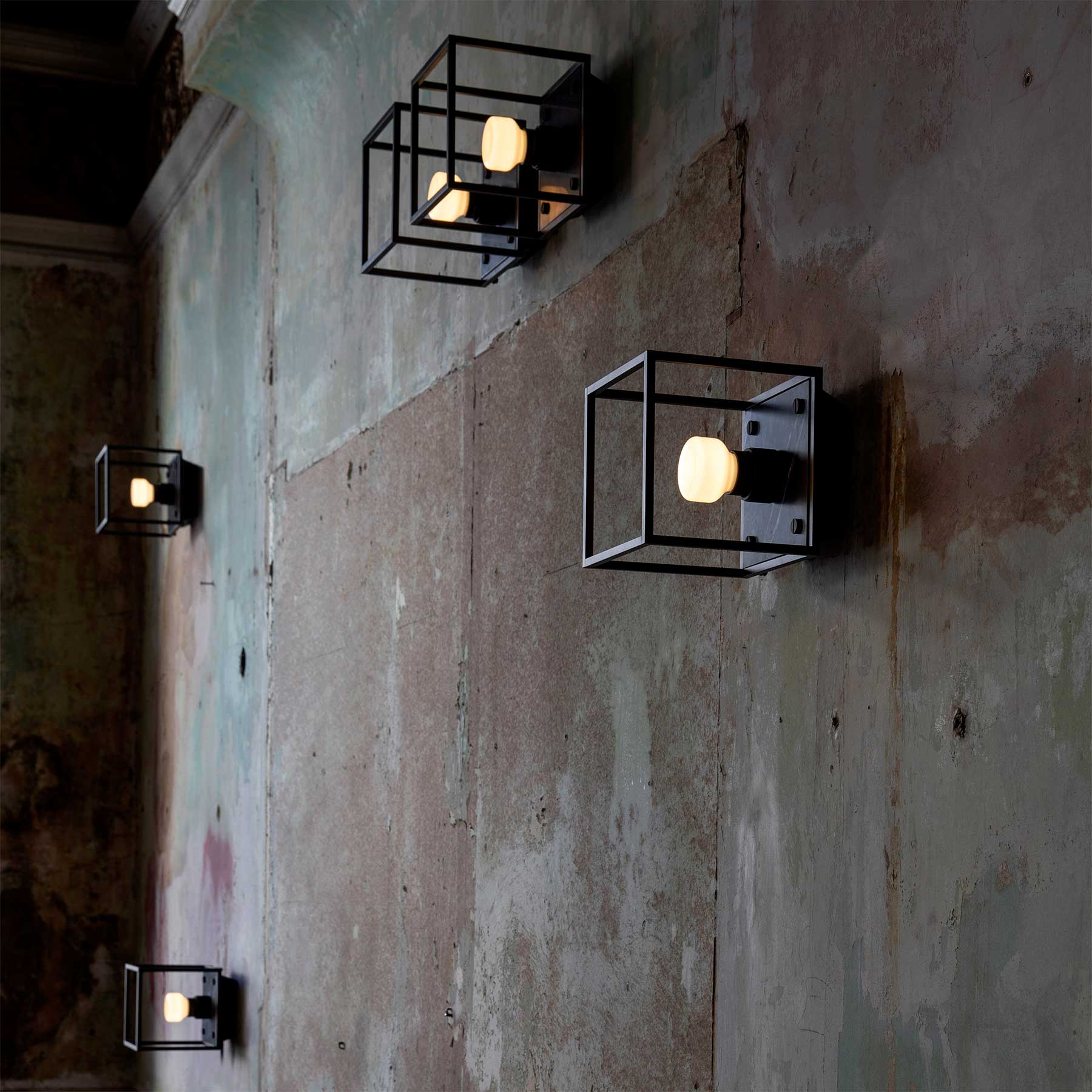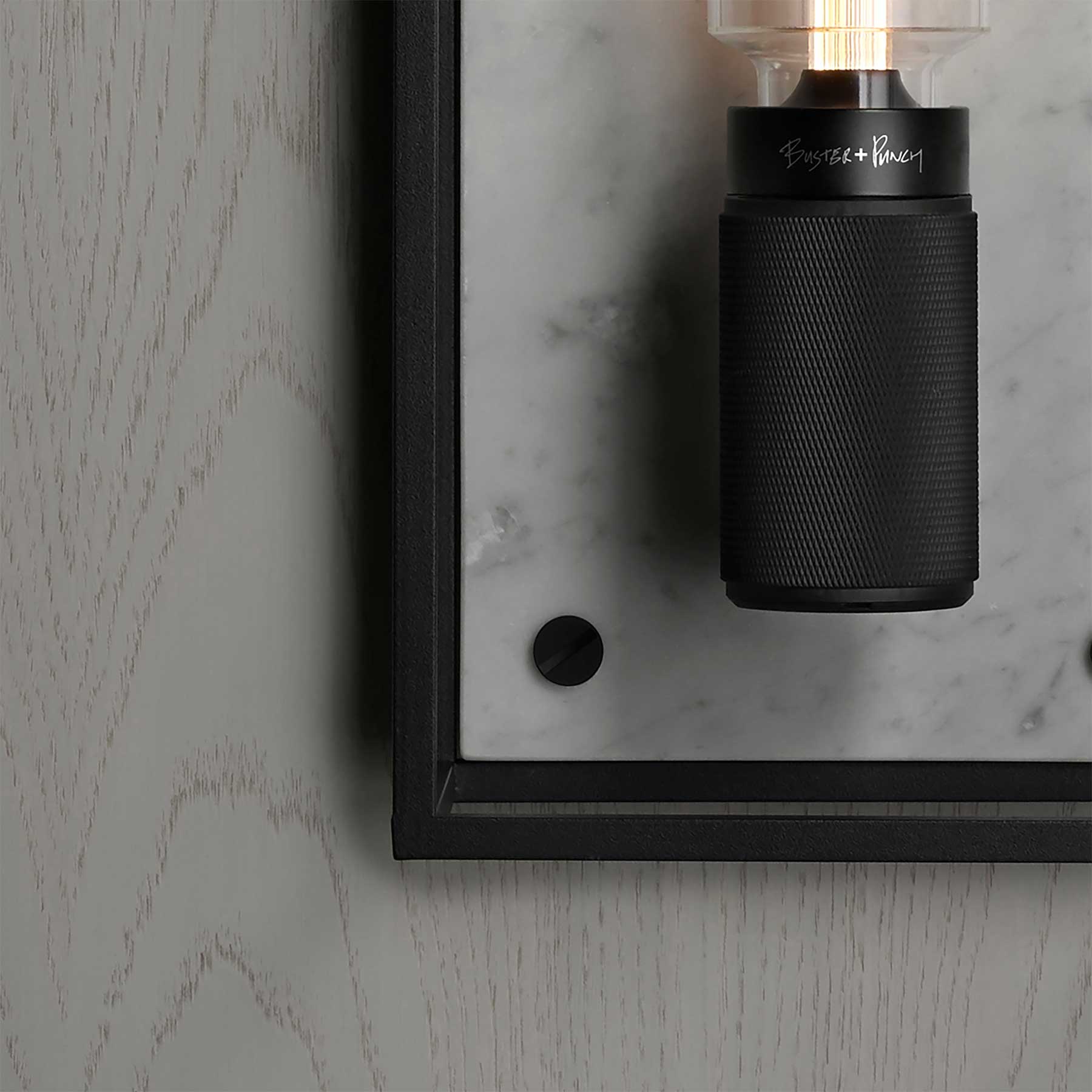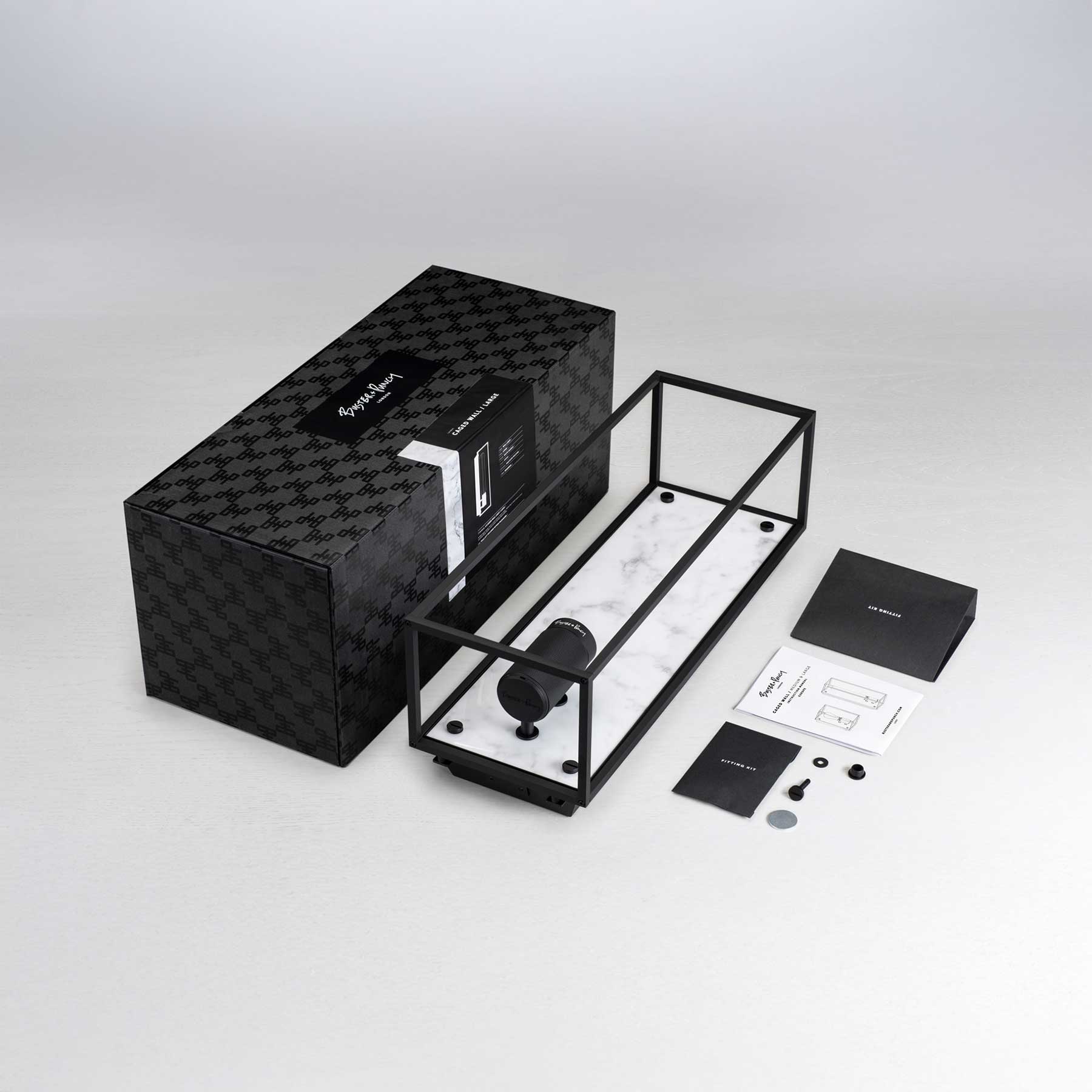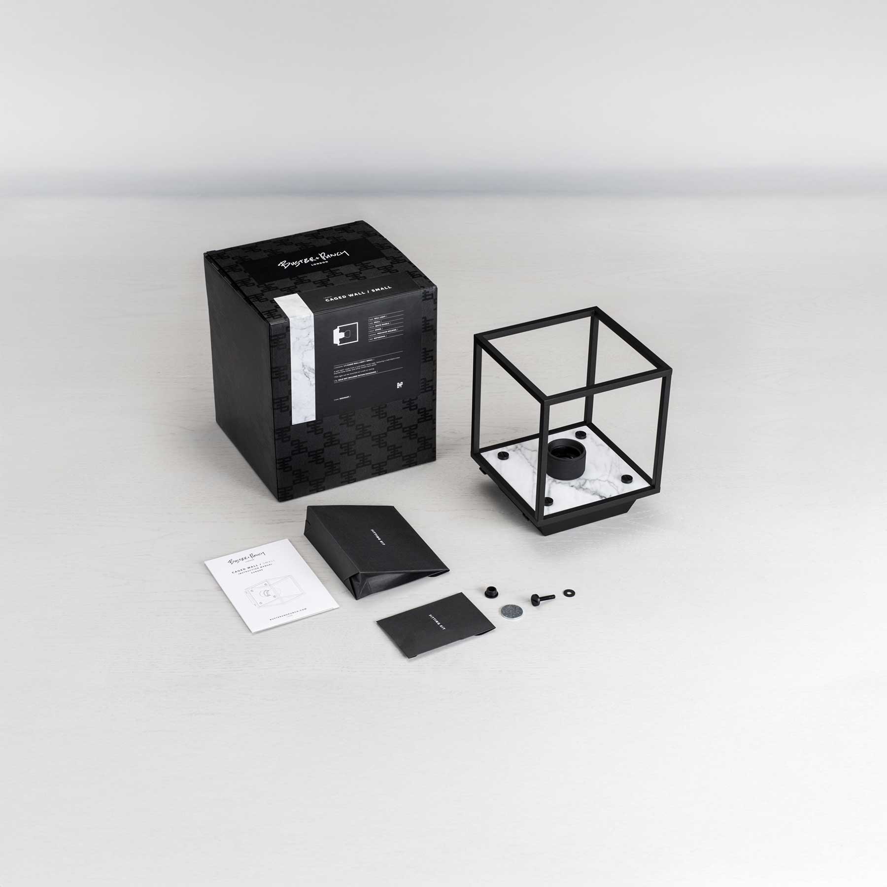 Nástěnné svítidlo Caged od londýnského designéra a výrobce Buster & Punch kombinuje matně černý kovový klecový design s elegantním zadním panelem z leštěného černého nebo bílého mramoru. Disponuje křížově vroubkovaným držákem na žárovku a charakteristickými mincovitými šrouby. Lze jej použít samostatně nebo v sérii pro větší vizuální efekt. Svítidlo je určeno pro LED žárovky s paticí E27 (žárovka není součást balení). Svítidlo je dostupné ve třech velikostech. Svítidlo je dostupné ve stmívatelné verzi (pro LED stmívače) nebo nestmívatelné (pro běžné vypínače) a může být připojeno přímo do zdi nebo externím kabelem (kabel není součástí balení).