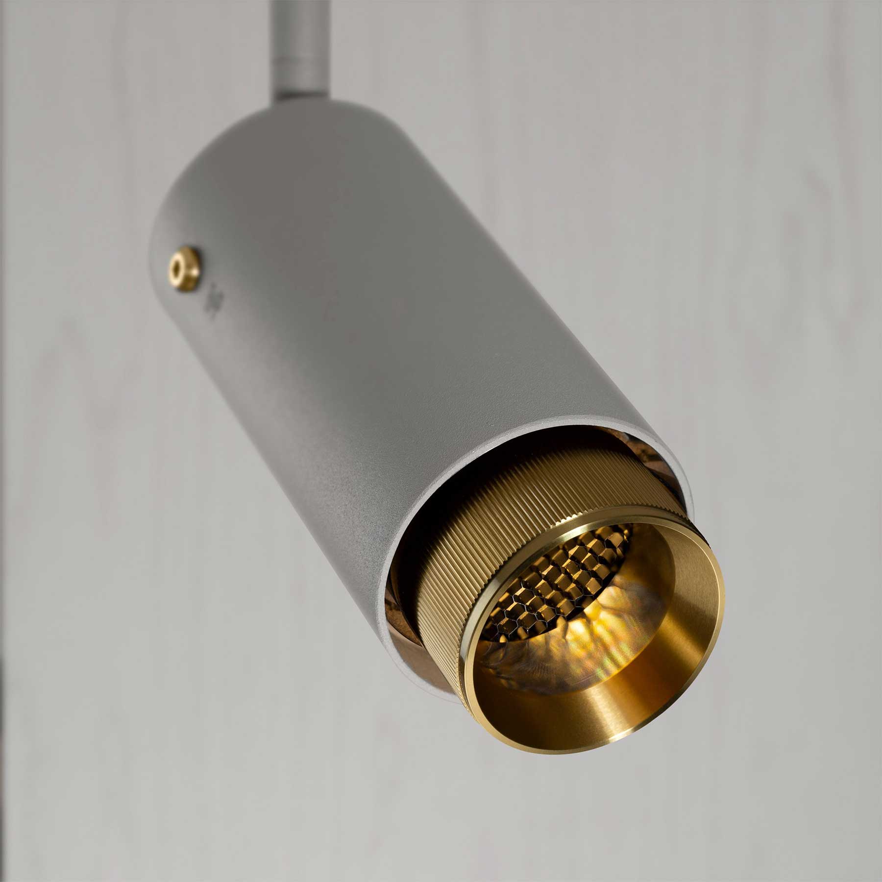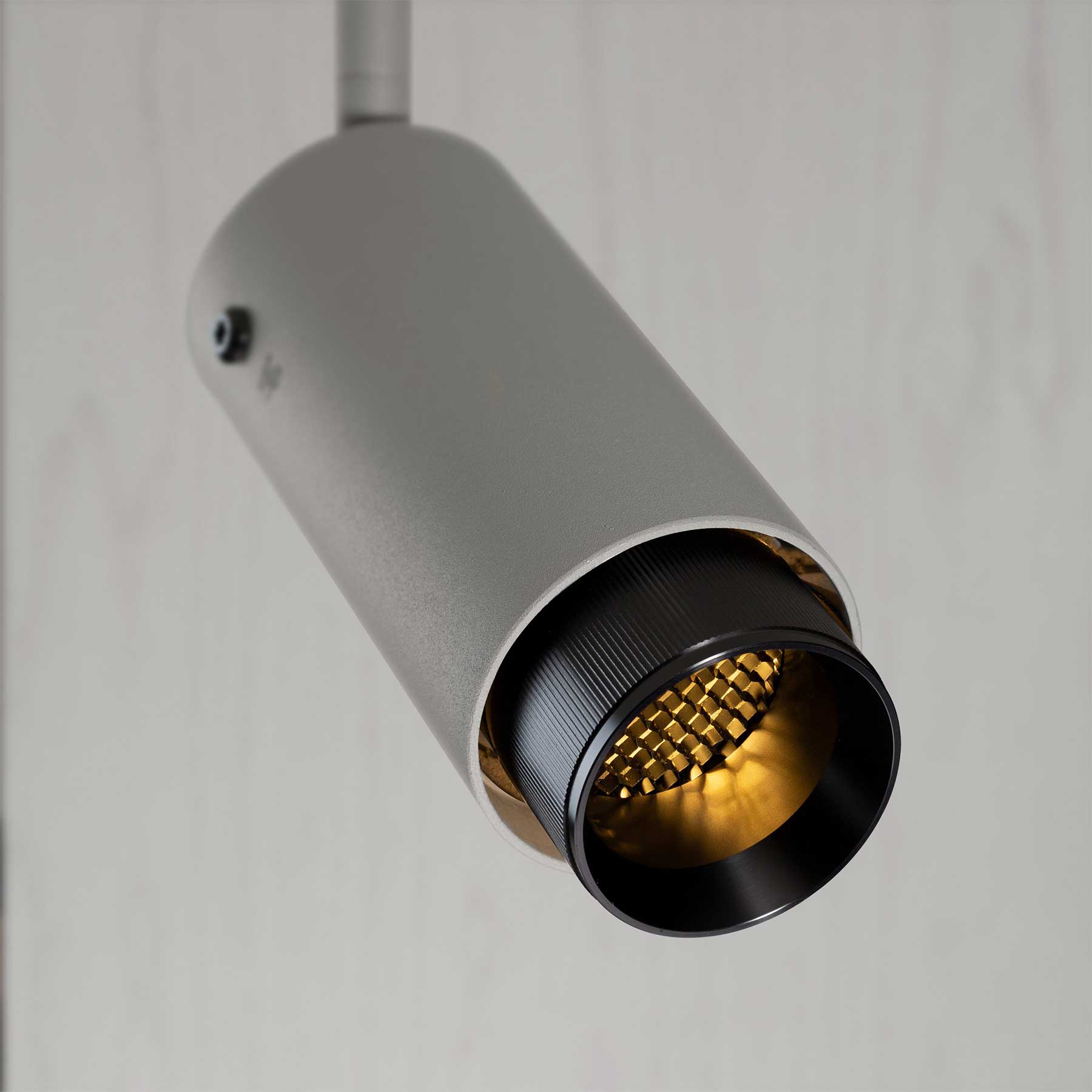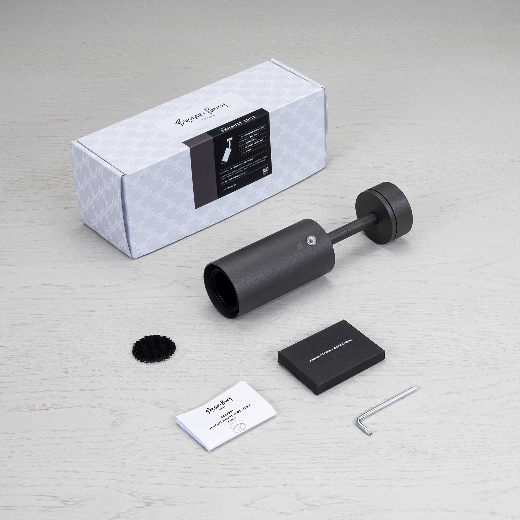 Nastavitelný bodový reflektor, od londýnské značky Buster & Punch, vyrobený z kovu s povrchovou úpravou z kamenného/grafitového prášku a doplněný o detaily z masivní oceli. Clona zachycuje světlo a vytváří jemný kovový lesk, zatímco honeycomb filtr zajišťuje přesné, neoslňující a směrové světlo. Reflektor je dále vybaven šrouby s Torx hlavou z masivní nerezové oceli. Reflektor je plně nastavitelný, dodává se s vestavěným stropním baldachýnem a je kompatibilní s žárovkami GU10. Součástí balení je také prodlužovací baldachýn v odpovídajícím kamenném/grafitovém kovovém provedení, která umožňuje instalaci na viditelné kabelové vedení.