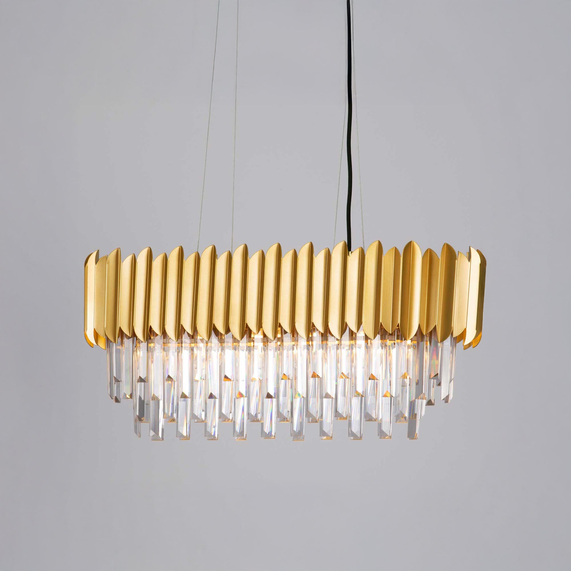 Závěsné svítidlo Nova Luce MAGNOLIA je zlatý křišťálový lustr. MAGNOLIA od Nova Luce představuje velmi elegantní a dekorativní svítidlo, které se hodí jak do moderních domácností, tak do klasických interiérů. Rám je vyroben z kovu, natřený luxusní zlatou barvou a zdobený obdélníkovými hranoly, které visí dolů v různých stupních. Při zapnutí svítidla vyzařuje přes hranoly krásné, měkké a příjemné světlo. Toto svítidlo je ideální pro umístění do jídelny nebo vstupního prostoru, kde může být doplněno dekorativními světelnými zdroji pro dokonalý výsledek. Závěsné svítidlo je vybaveno paticí pro žárovky E14, což umožňuje volný výběr žárovek pro individuální osvětlení.
