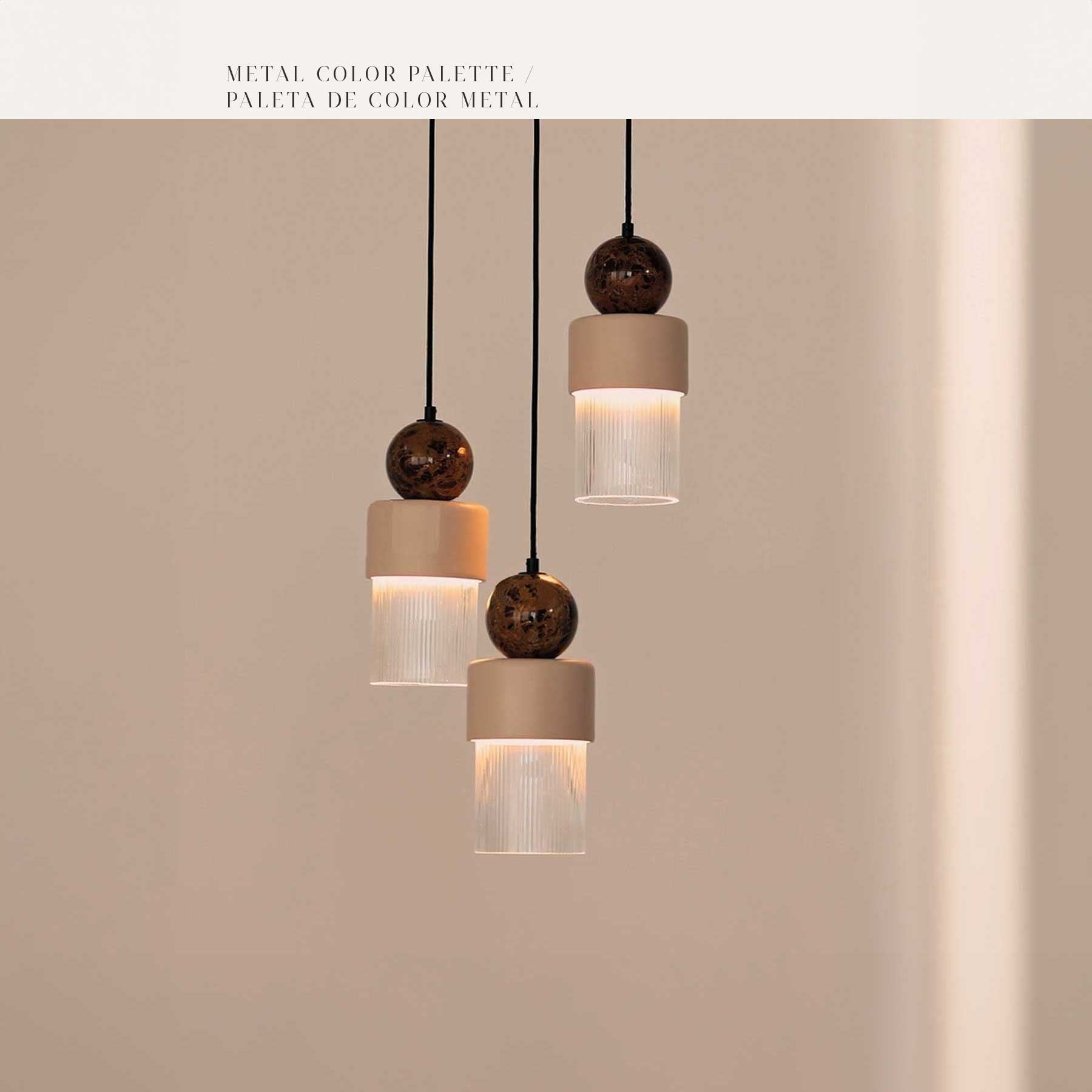 Závesné svietidlo Glamm navrhnuté spoločnosťou AC Studio na dekoratívne osvetlenie interiéru vyniká jedinečnou kombináciou materiálov a štýlu. Dizajn svietidla zahŕňa guľovitý mramorový prvok, keramický kryt a priehľadný sklenený difúzor s jemným rebrovaním, ktorý rovnomerne rozptyľuje svetlo. Povrchovú úpravu je možné meniť podľa farebnej palety a dostupných povrchových úprav uvedených nižšie. Svietidlo je vybavené technológiou LED s farebnou teplotou 2700 K, výkonom 7 W a svetelným tokom 700 lm, čo zaručuje príjemné a účinné osvetlenie. Je tiež stmievateľné pomocou technológie TRIAC, čo umožňuje nastaviť intenzitu svetla podľa potreby. Glamm sa stane elegantným a štýlovým doplnkom každého interiéru.